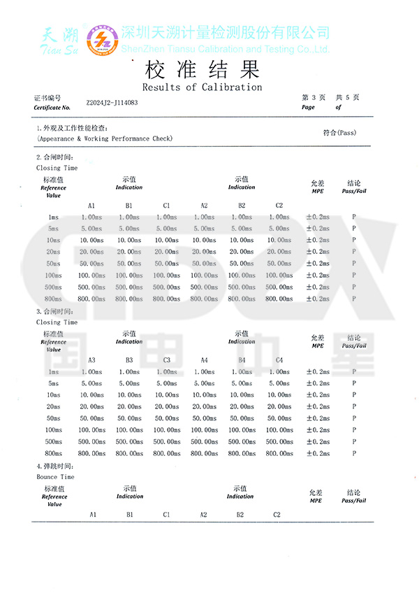 ⑷、可測斷口合、分閘時間、三相不同期、彈跳時間及次數(shù)